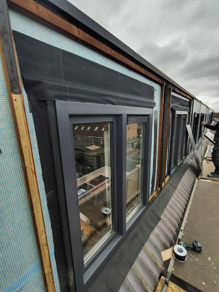 - Leveren een aanbrengen kunststof kozijnen, RAL 7016 met draai-kiepfunctie en inzethorren.