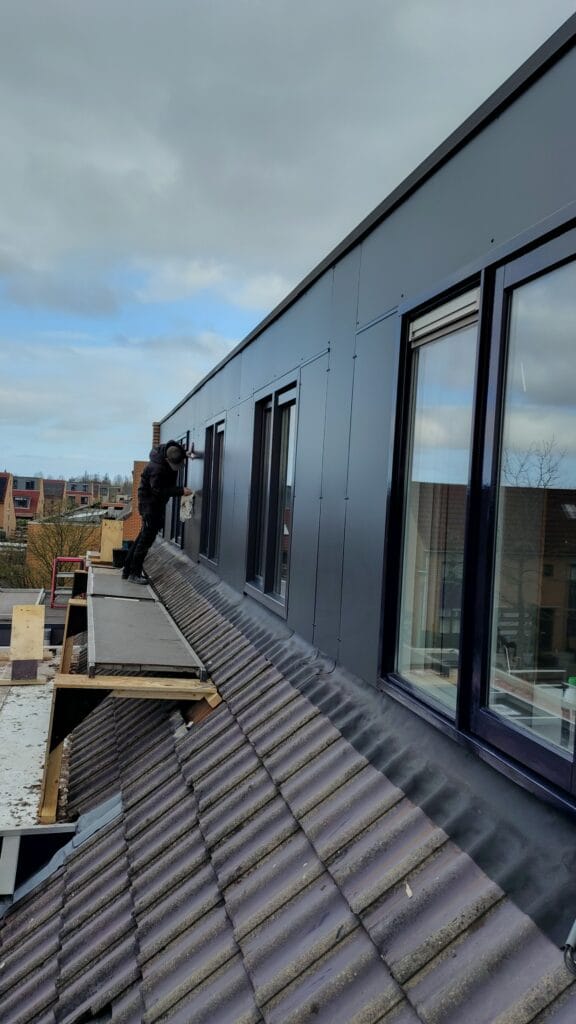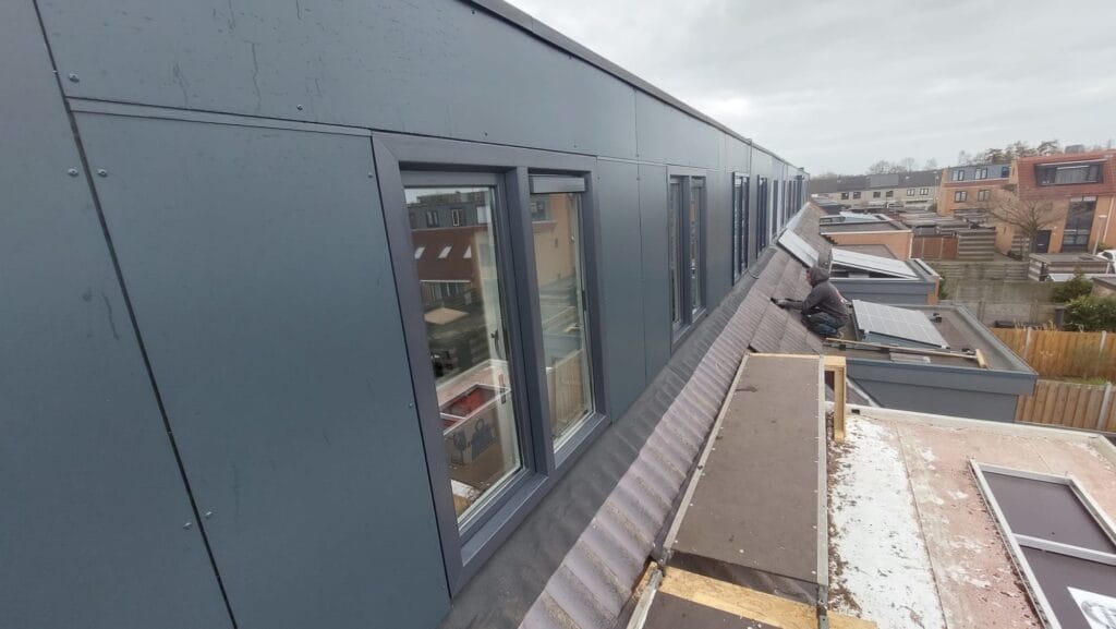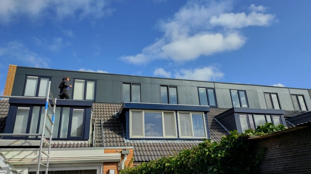 De oude rockpanel gevelbekleding aan de Nijenburg in Hoofddorp was lelijk, verweerd en dus nodig aan vervanging toe. Ook het lood vertoonde scheurvorming, wat bij meerdere woningen voor lekkages zorgde.