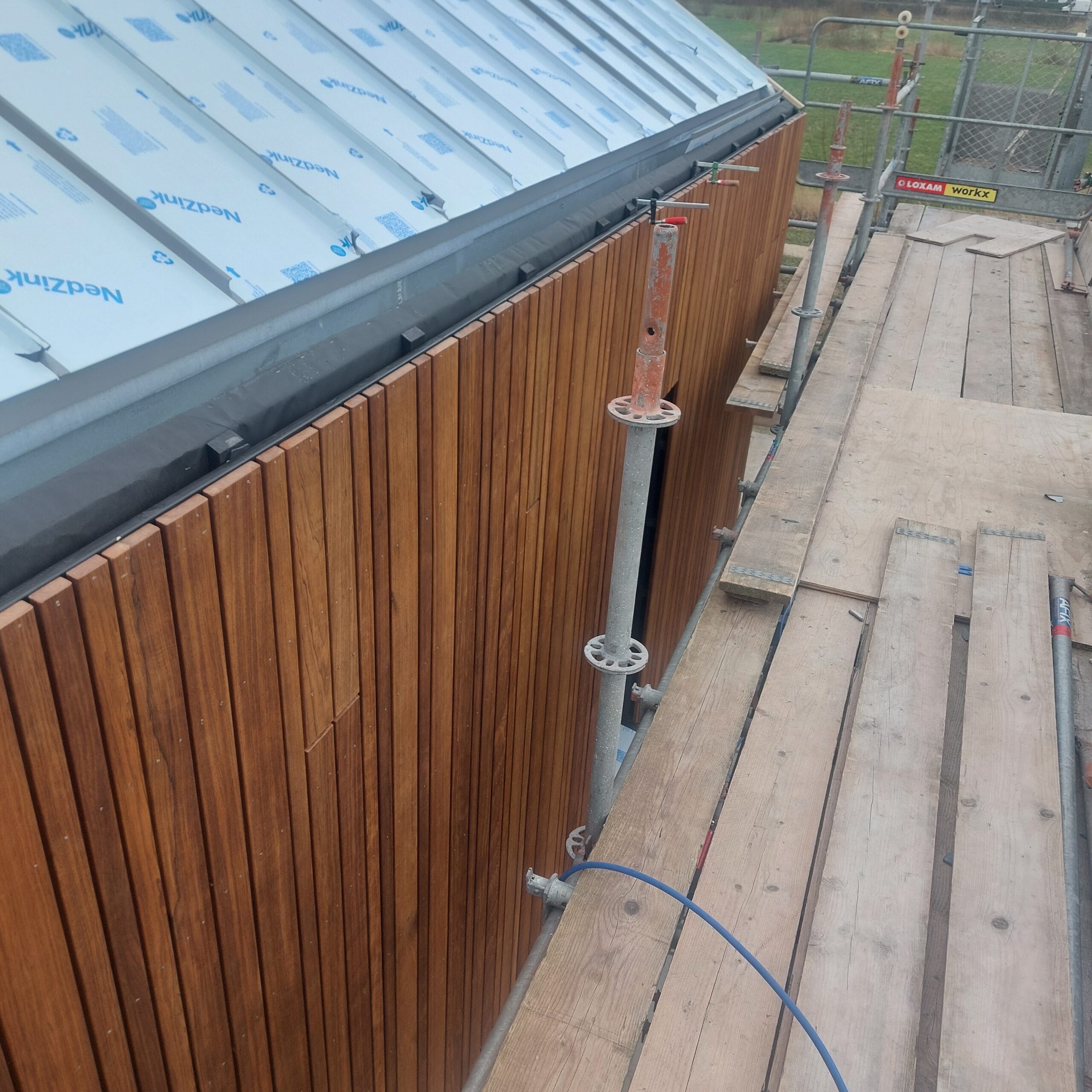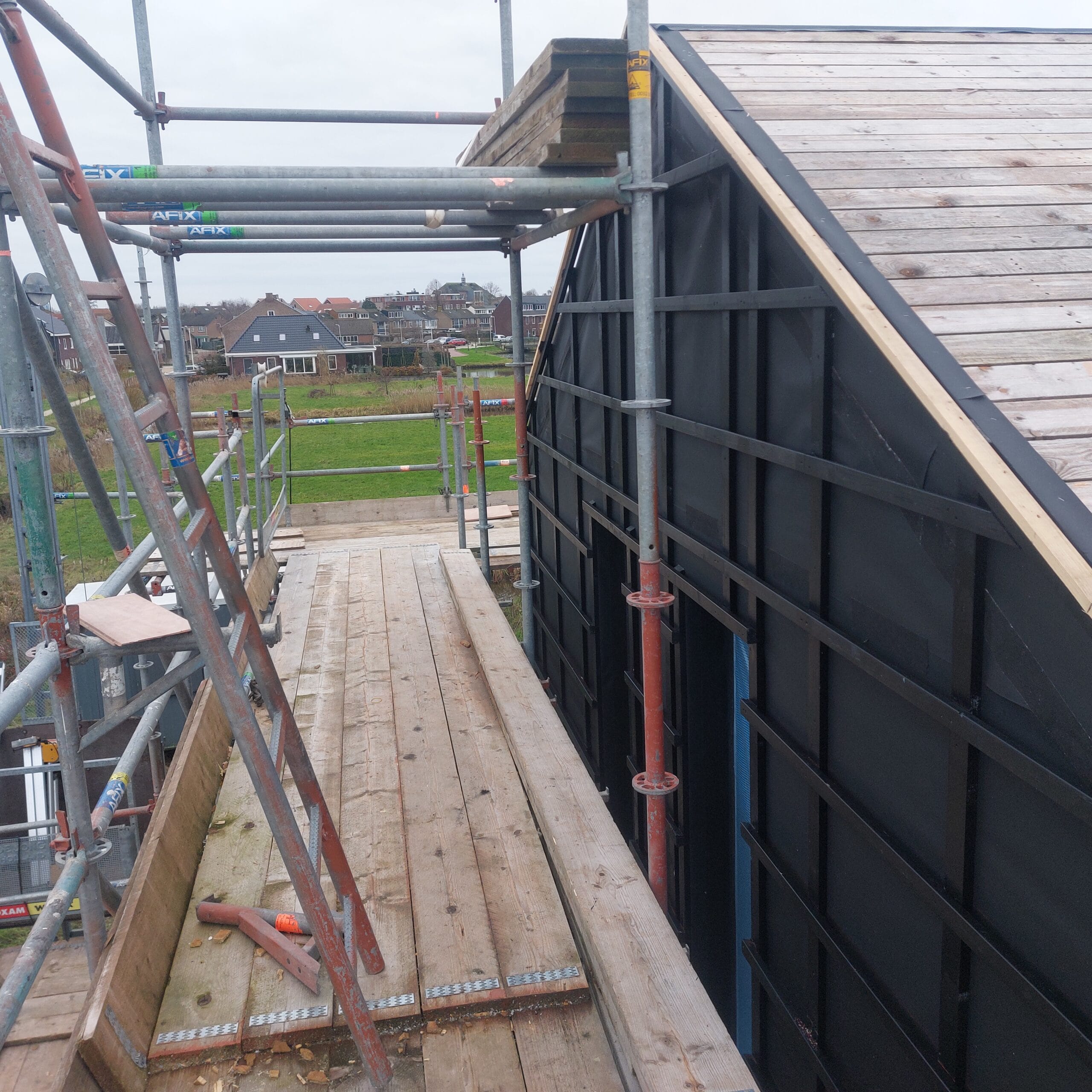 Voor deze bijzondere woning in Langeraar hebben we de gehele gevel mogen opbouwen. De gehele achterconstructie voor het zinkwerk en de open Fraké buitengevel was bij elkaar een heel timmertje!