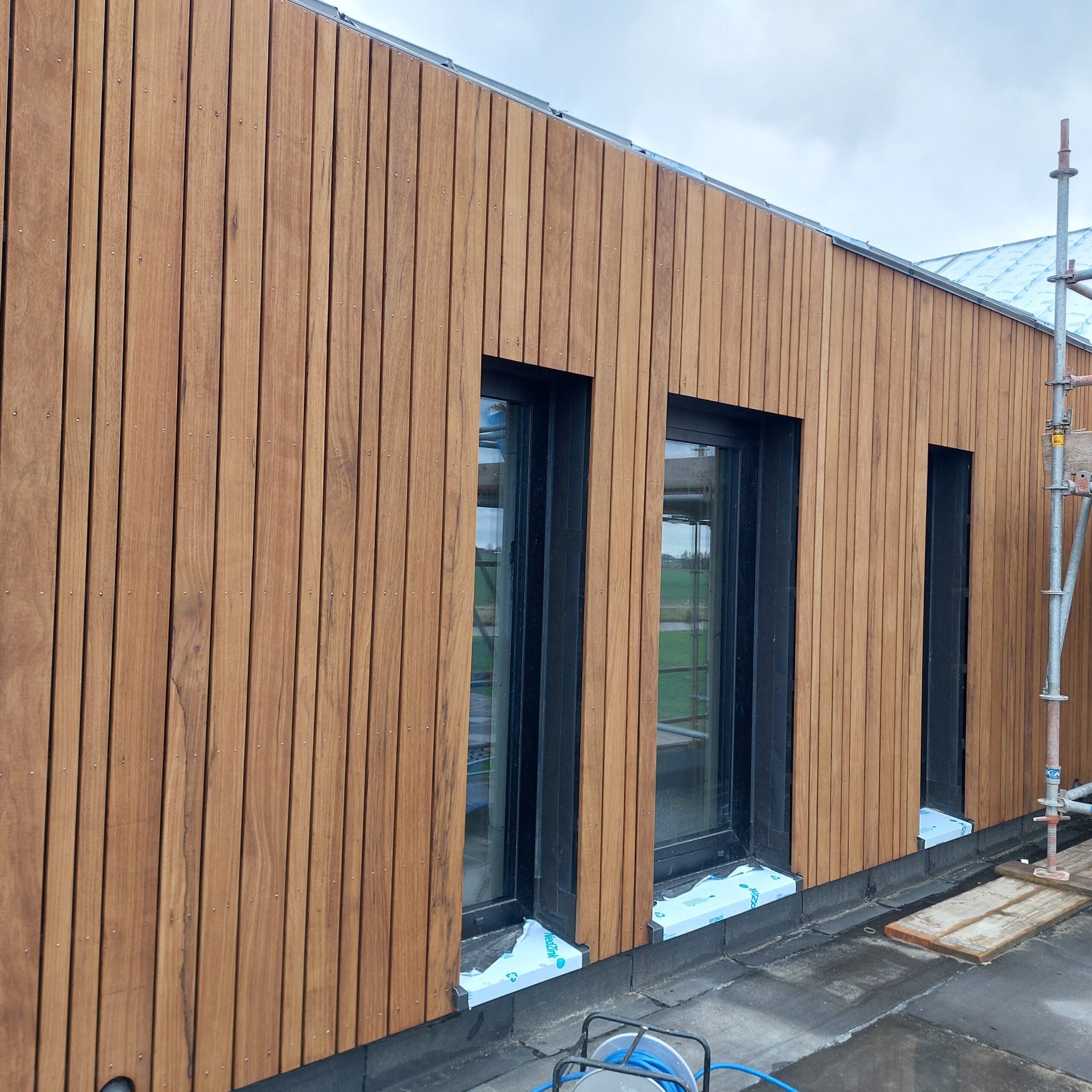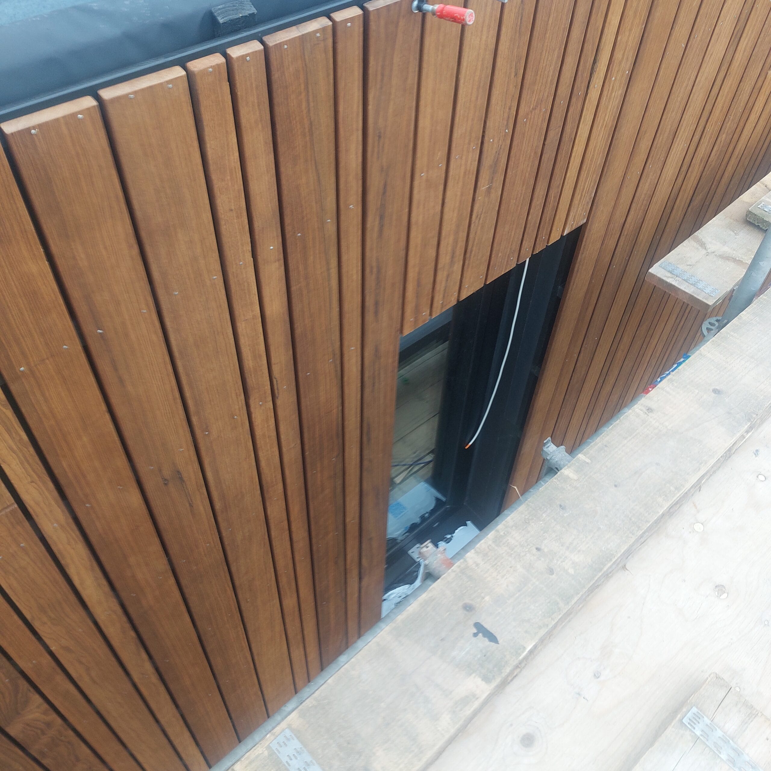 - Uittimmeren en bekleden houten gevel. Verticaal gemonteerde fraké latten